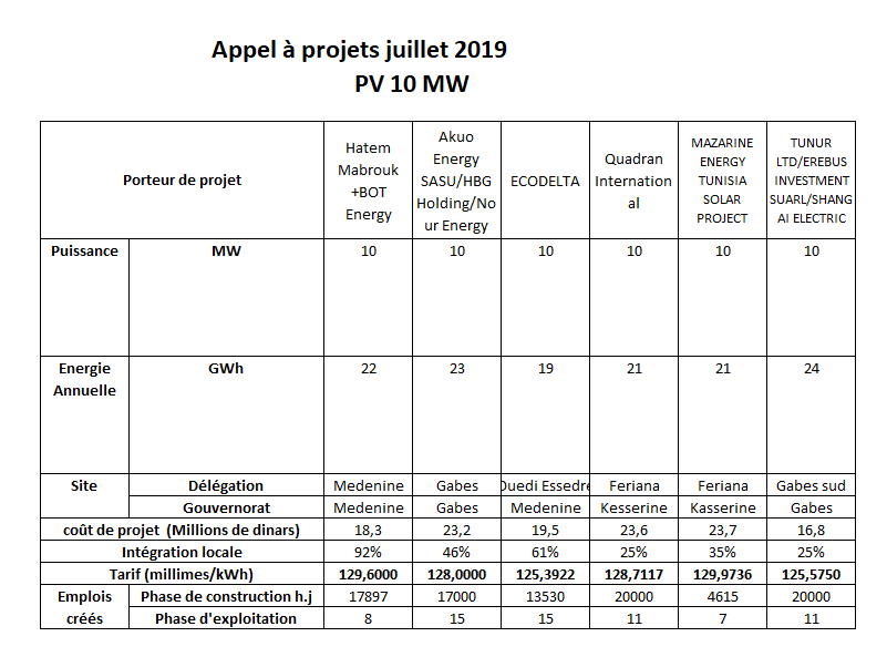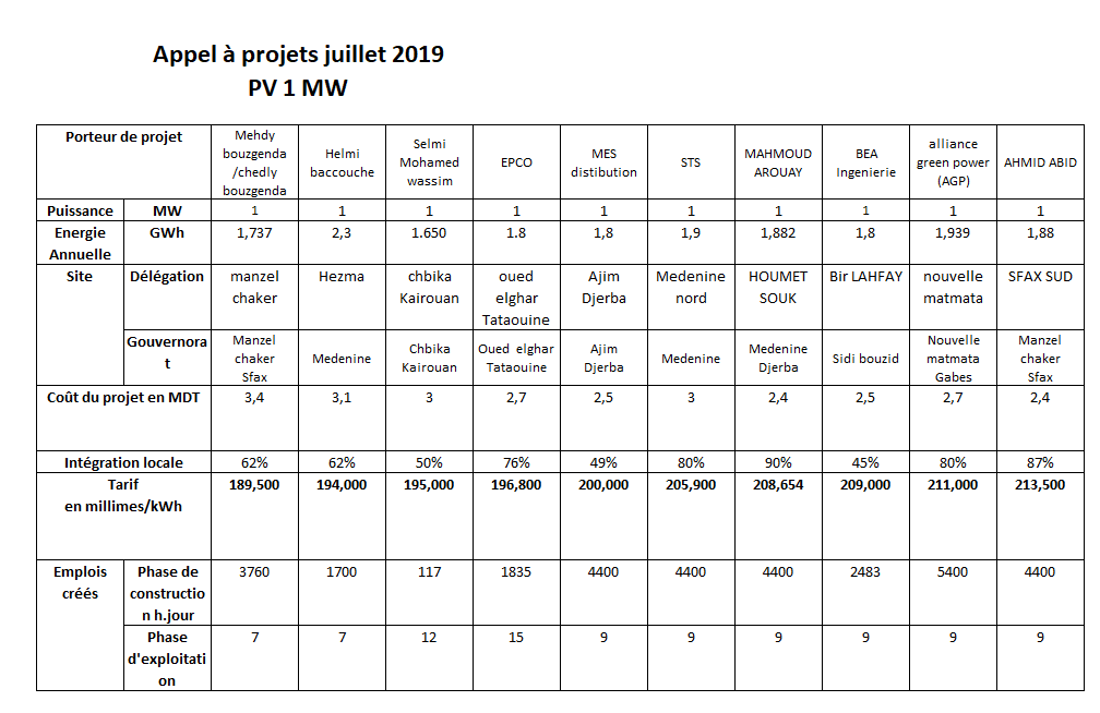 قائمة مشاريع الطاقة المتجددة التي وقعت الموافقة المبدئية عليها في الدورة الثالثة، اليوم الأربعاء 17 جوان 2020. الجدول الأول يخص المشاريع ذات 10 ميغاواط والثاني المشاريع ذات 1 ميغاواط.